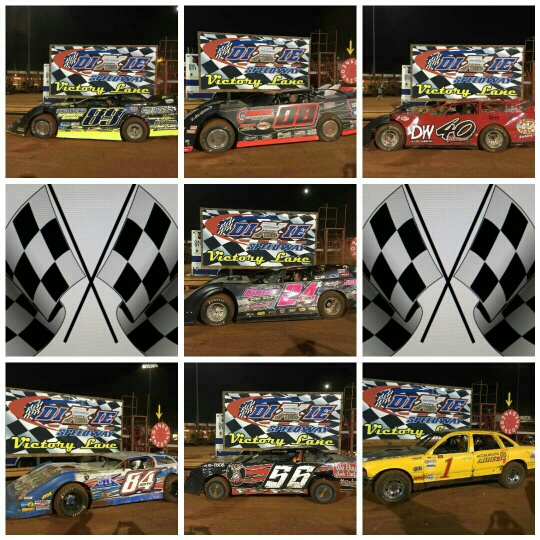 Congratulations August 1st Feature Race Winners- From top left-, Steelhead/525- Michael Page, Crate Late Model- Justin Shipley, Super Bomber- Andy Morris, Center- Super Late Model- Frank Ingram, Econo Bomber- Austin Smith, Pony Stock- Mitchel Pope, Street Cruiser- George Wilson, Dixie Speedway will be off this Saturday night August 8th and will return August 15th with Waterless Boat Racing on Dirt plus a full race program.