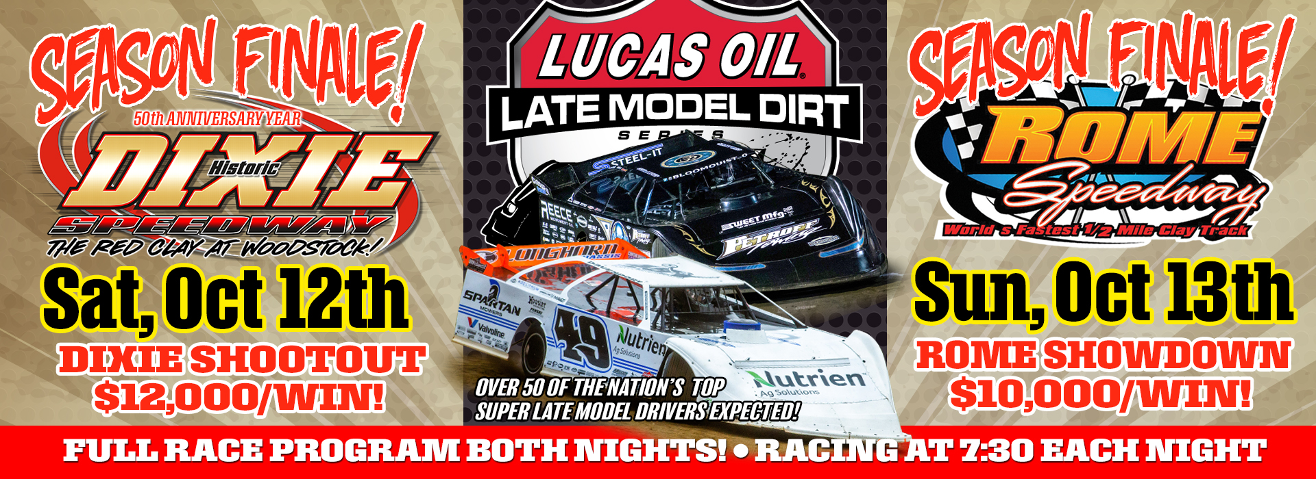 It’s a Season Finale you don’t want to miss. The Lucas Oil Dixie Shootout and Rome Showdown Saturday Oct. 12th and Sunday Oct 13th.