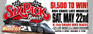$1500 to win Six Pack Bonus Race for 604 Crate + 525 Late Models & lower divisions & K-5th grade Bike Races