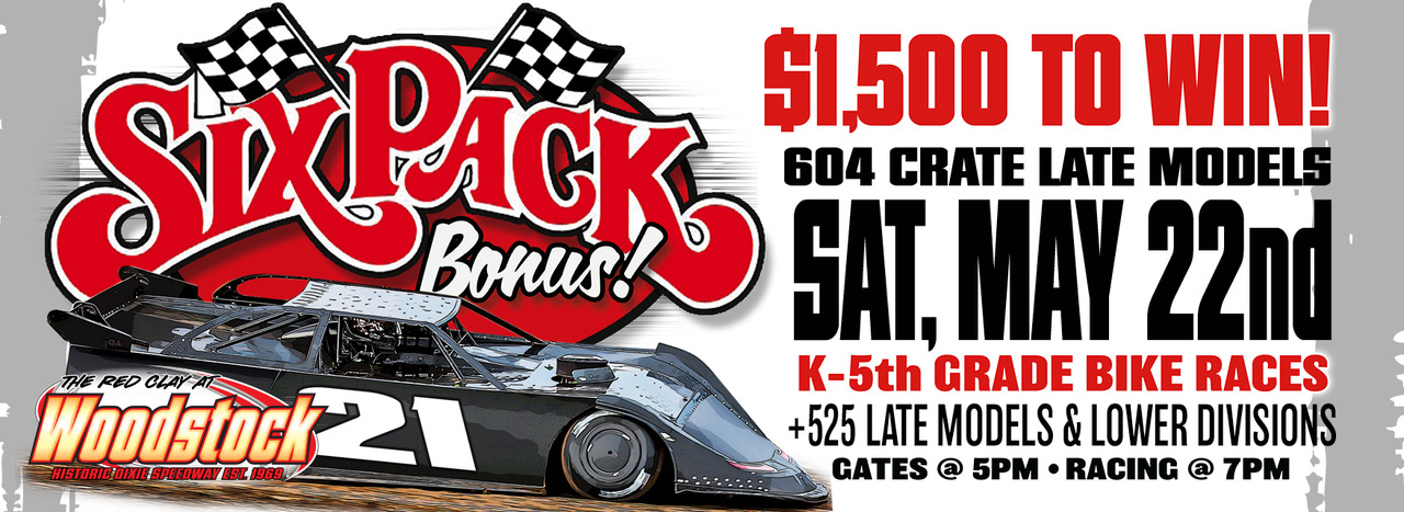 $1500 to win Six Pack Bonus Race for 604 Crate + 525 Late Models & lower divisions & K-5th grade Bike Races