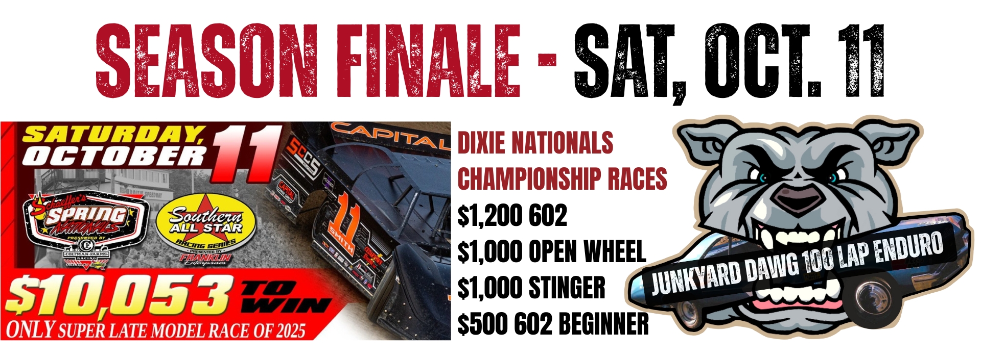 SEASON FINALE – Dixie Nationals $10,053 Schaeffer’s Oil Super Late Models/Southern All Stars + $2500 JUNKYARD DAWG ENDURO RACE + Dixie Nationals Championship Races in Lower Divisions