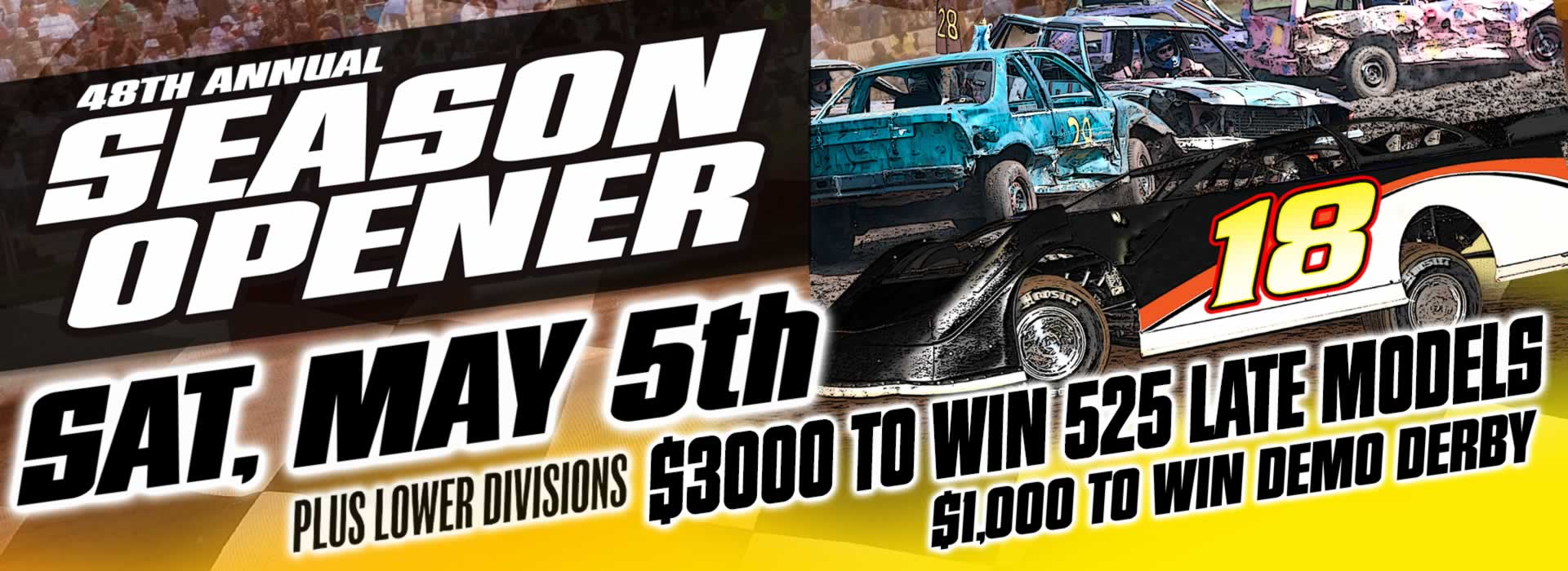 49th Season Opener-$1000 to win DEMO DERBY + Chevy Performance Parts 525 50 Lap $3000 to win + Steelhead, Crate, 602, Econo Bomber, Stinger