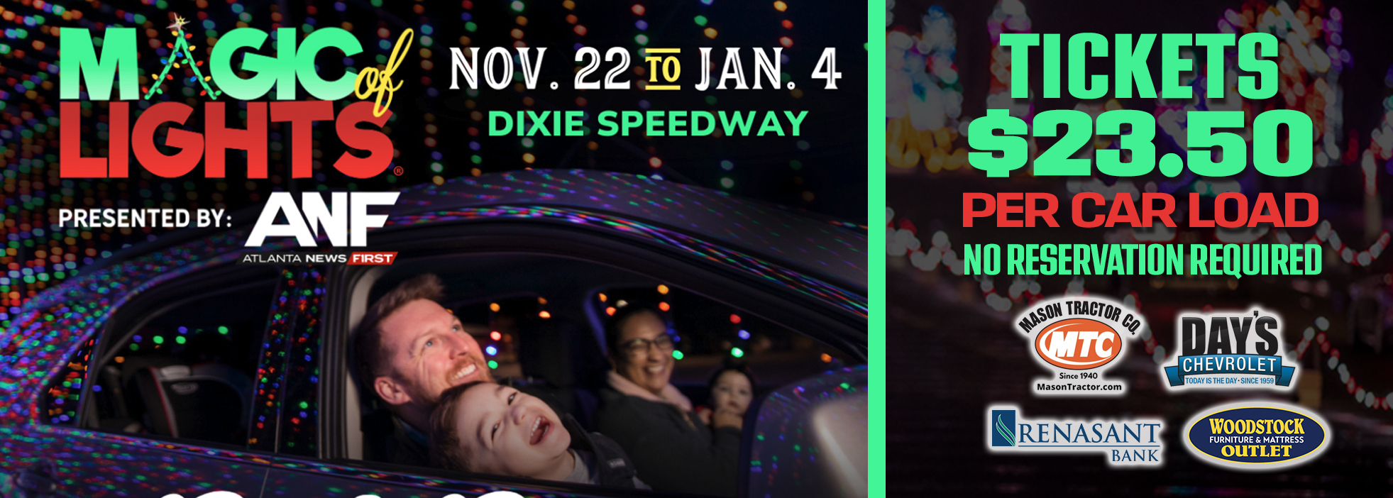 “We are excited to host the Magic of Lights Drive-through holiday tour again this season,” said Mia Green, Vice President of Dixie Speedway. “Lighting up Dixie Speedway with over 2 million holiday lights is an awesome way for our community to celebrate the holiday season. This is becoming a holiday tradition for our Cherokee County community and the North Georgia area! This year a portion of ticket sales will go to the Cherokee County Fire Foundation and Cherokee County First Responders.