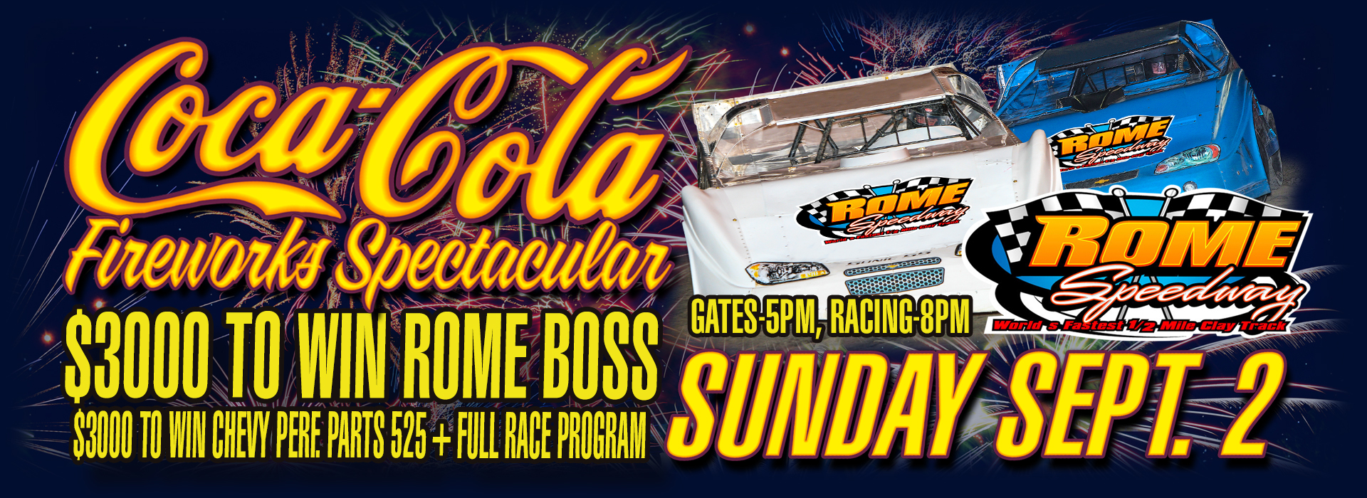 CoCa Cola Labor Day FIREWORKS Spectacular + $3000 To Win Rome Boss + $3000 to win Chevy Perf. Parts 525 + Full Race Program