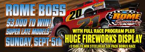 The Nation’s Fastest Half Mile Rome Speedway’s is racing this Sunday September 5th with the Annual $3000 to win Rome Boss Super Late Model + $1500 to win Six Pack Bonus Race for Steelhead Late Model along with a full race program and a Gigantic Coca Cola Fireworks Display!!