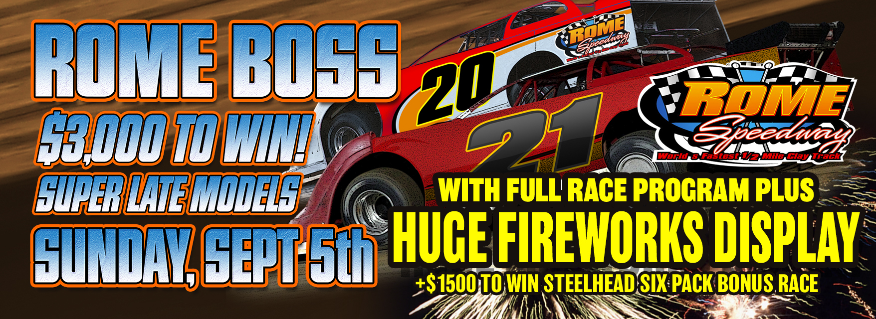 ROME SPEEDWAY-FIREWORKS + $3000 to win Rome Boss + $1500 to win Six Pack Steelhead Race + Full Race Program-All Divisions Racing