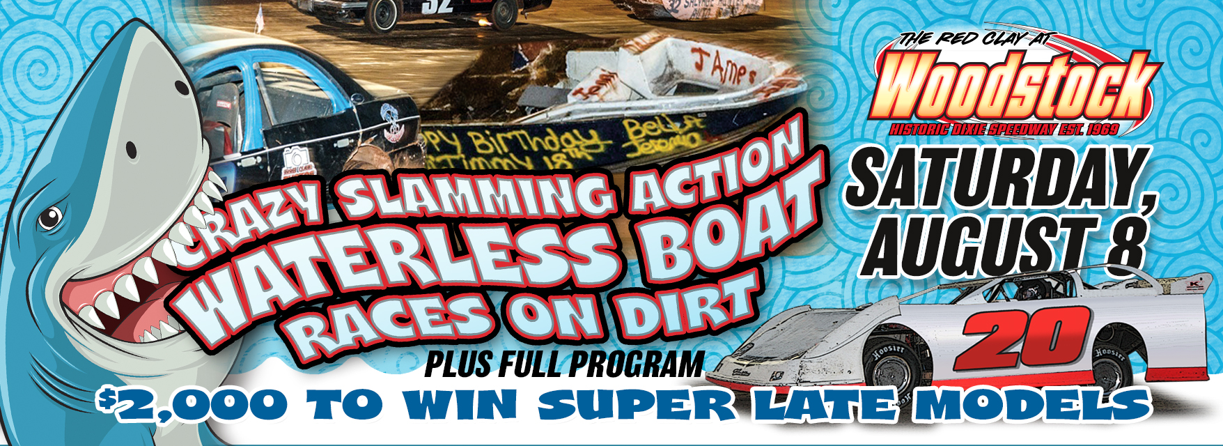 The action returns on Saturday August 8th. It’s time for the ever popular, slamming , sideways action of WATERLESS BOAT RACING ON DIRT!!! …the last boat standing WINS! Fans will also see a full race program including those 900 HP Super Late Models in a $2000 to win feature race plus a full race program!