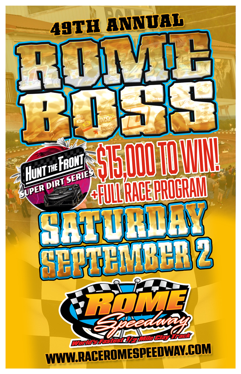 Be at the Nation’s Fastest Half Mile Clay Track- Rome Speedway this Saturday night September 2 for the Hunt the Front Super Dirt Series $15,000 to win Rome Boss! Fans will see the region’s top Super Late Model drivers battle it out at speeds of 140mph for the historic $15,000 to win Rome Boss Championship Title plus a full stock car racing program! Over 100 race cars expected! Don’t miss your last chance to see Super Late Models this season at Rome Speedway this Sunday night September 2nd!